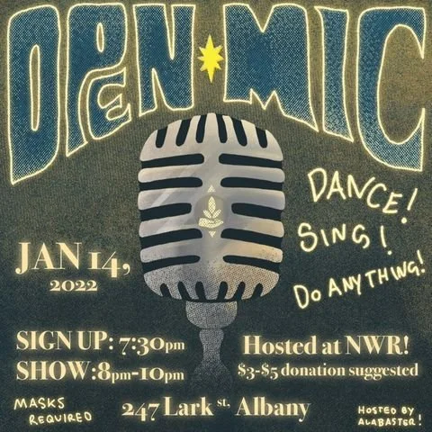 Open Mic with Alabaster Friday, January 14, 2022 7:30 PM 10:00 PM NWR Community Center 247 Lark Street, 2nd floor Albany, NY United States (map) Google Calendar ICS