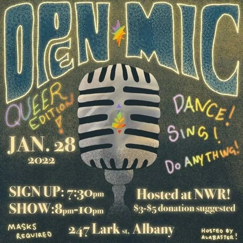 Queer Open Mic with Alabaster Friday, January 28, 2022 7:30 PM 10:00 PM NWR Community Center 247 Lark Street, 2nd floor Albany, NY United States (map) Google Calendar ICS Sign Up Now