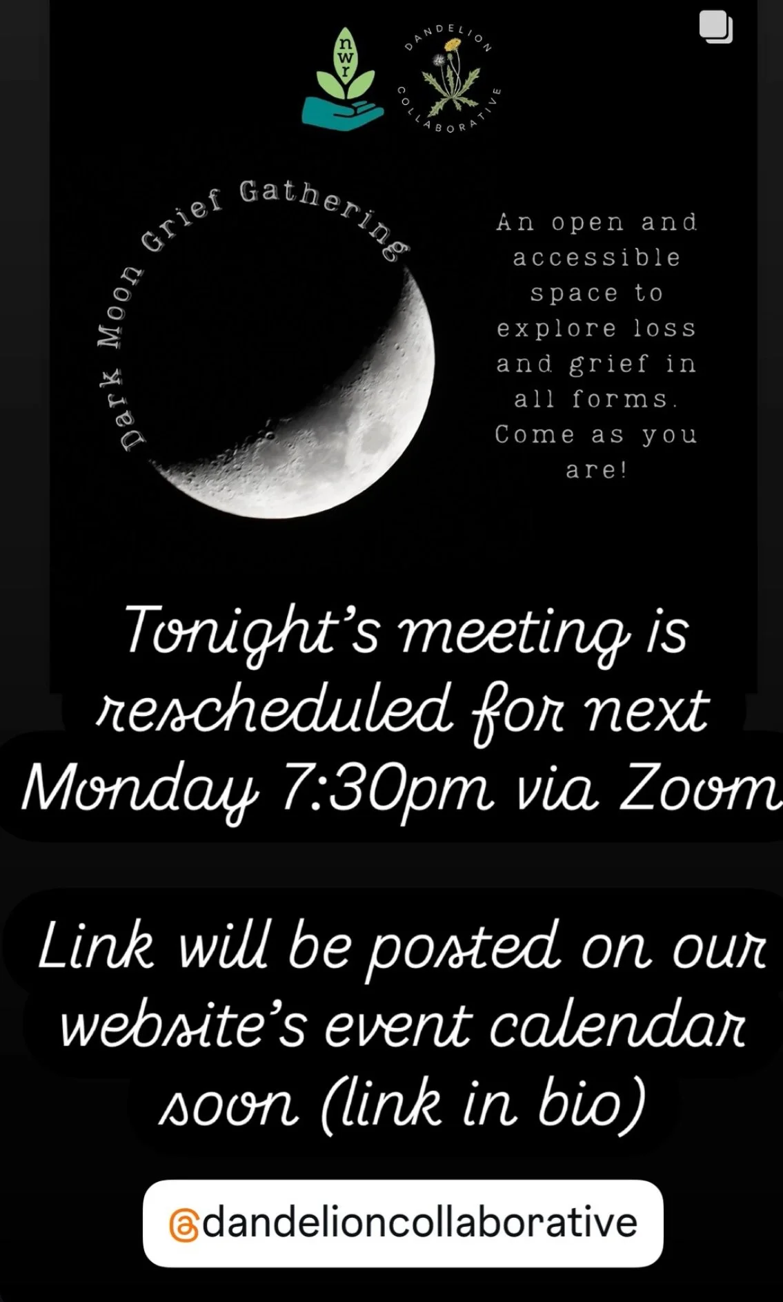Dark Moon Grief Gathering is a safe, open, and accessible space to explore grief holistically, in community, without any expectations. Amy, Founder of Dandelion Collaborative, will facilitate discussions, meditations, rituals, or other therapeutic activities, with the intention of encouraging recognition, communication, and processing of grief feelings so we can learn to move through the world despite our burden. Come as you are.
